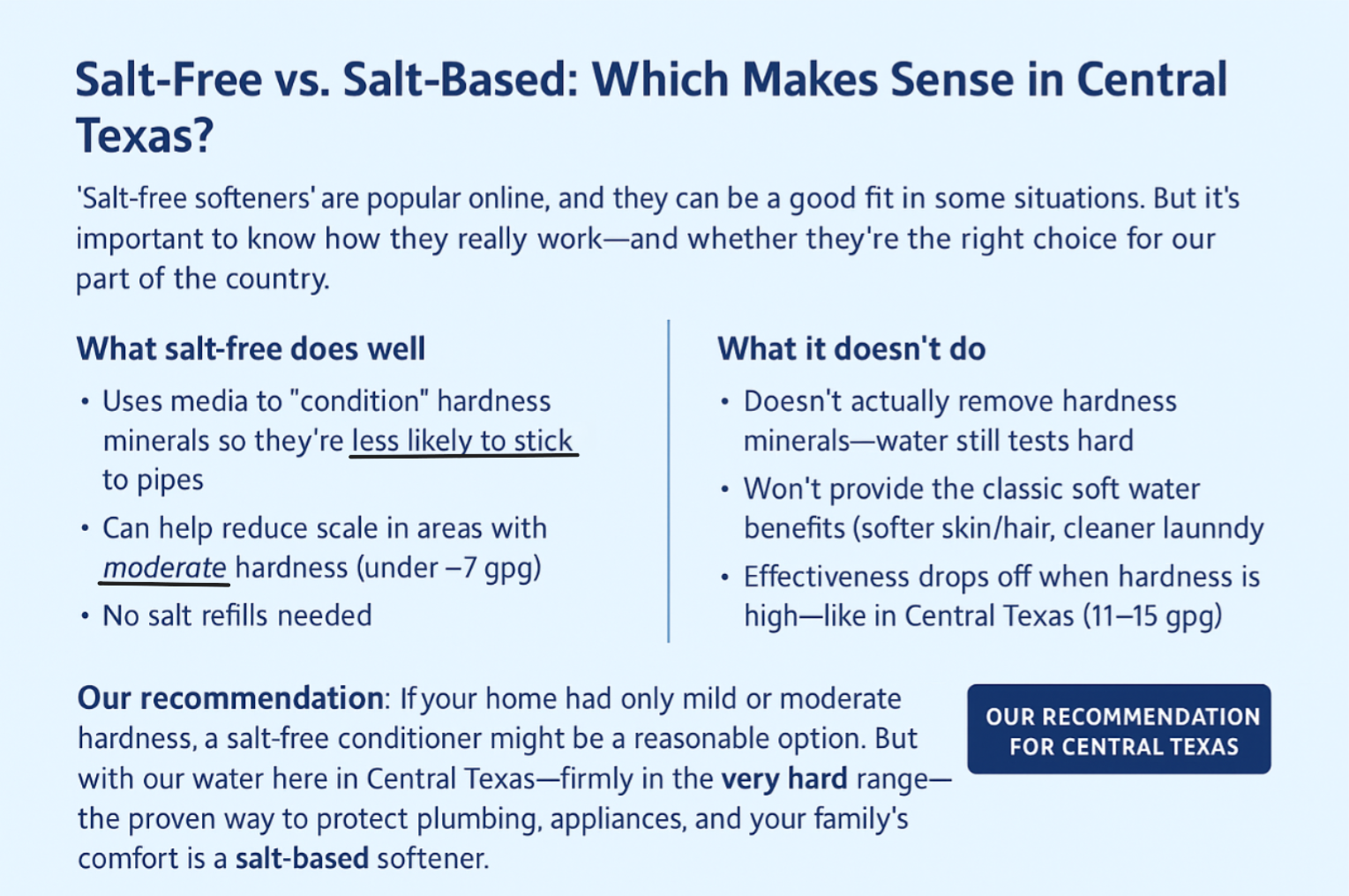 If you’re in Central Texas and you’re seeing white spots, scale on fixtures, or dealing with dry skin/dull hair, a softener is the most effective way to stop those issues and protect your home’s plumbing and appliances.